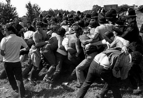 Police and pickets fight at Llanwern in south Wales, July 1984: The 1984-85 miners’ strike became a bitter industrial dispute and symbolic class struggle that saw picketing miners pitched against police officers, and colleagues — so-called scabs — who chose to return to work. The National Union of Mineworkers was protesting at the government’s plans for pit closures but proved a terrible defeat for the miners and for the coal industry. In 1984 there had been 170 coal mines open in the UK. By 2004 fewer than a dozen mines were still open. The British trade union movement has never recovered.