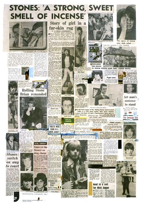Swingeing London 67 — Poster 1967-8: One of pop artist Richard Hamilton’s protest pictures in his Swingeing London series, commenting on the severe judgment passed on his friend, gallery owner Robert Fraser, and popstar Mick Jagger, for possession of drugs. (Photolithograph © Richard Hamilton published by ED912, in Tate collection)