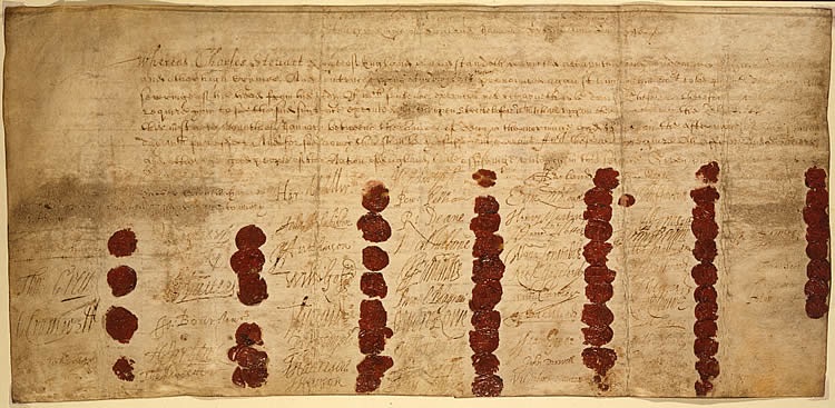 Death warrant of King Charles I (1649): Showing the signatures and seals of 59 of the commissioners who tried Charles I, including that of Oliver Cromwell. This document directly led to the execution of the king, the abolition of the monarchy, and the consequent establishment of a republic to govern England for the only time in its history, between 1649 and 1660. © Parliamentary Archives