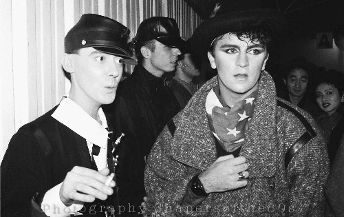 The 1983 look that inspired the portrait: Stephen Linard sports a leather Confederate Army cap $15 from Alaska, and Yohji Yamamoto jacket £250, over giant-collared Yohji shirt £120. Artfully placed on his left lapel is a silvered bathroom tap £60 and faucet brooch £40, both from a jewellery collection for Chloe, Paris. Seen here with Lee Sheldrick (rear) and Steve Strange at the Worlds End fashion show in Paris that October. Photographed © by Shapersofthe80s