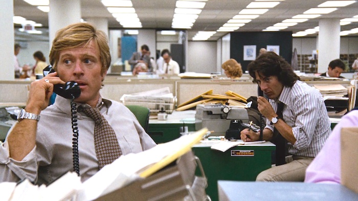 ❏ Bob Woodward on writing the book on which the film was based: “Carl Bernstein and I were going to do a standard narrative about Watergate from the perspective of the Nixon White House” . . . Redford: “I said my interest is different, my interest is you guys and how you worked” . . . Bernstein: “Woodward came up to me one day and said he’d gotten a call from Robert Redford, and I said what the hell about? And he said, well, he thinks the story is really us. At the time we were still reporting the story and we sure didn’t think the story was really us.”
