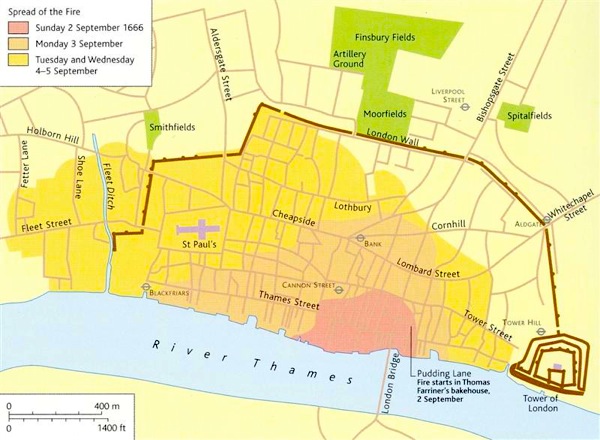 Colours show the progress of the Great Fire of London: it began on the night of September 2, 1666, on Pudding Lane, in the shop of Thomas Farynor, baker to King Charles II. It raged for four days, destroyed three-quarters of the City’s wooden buildings, and spread even beyond the medieval walls to the west. (Museum of London)