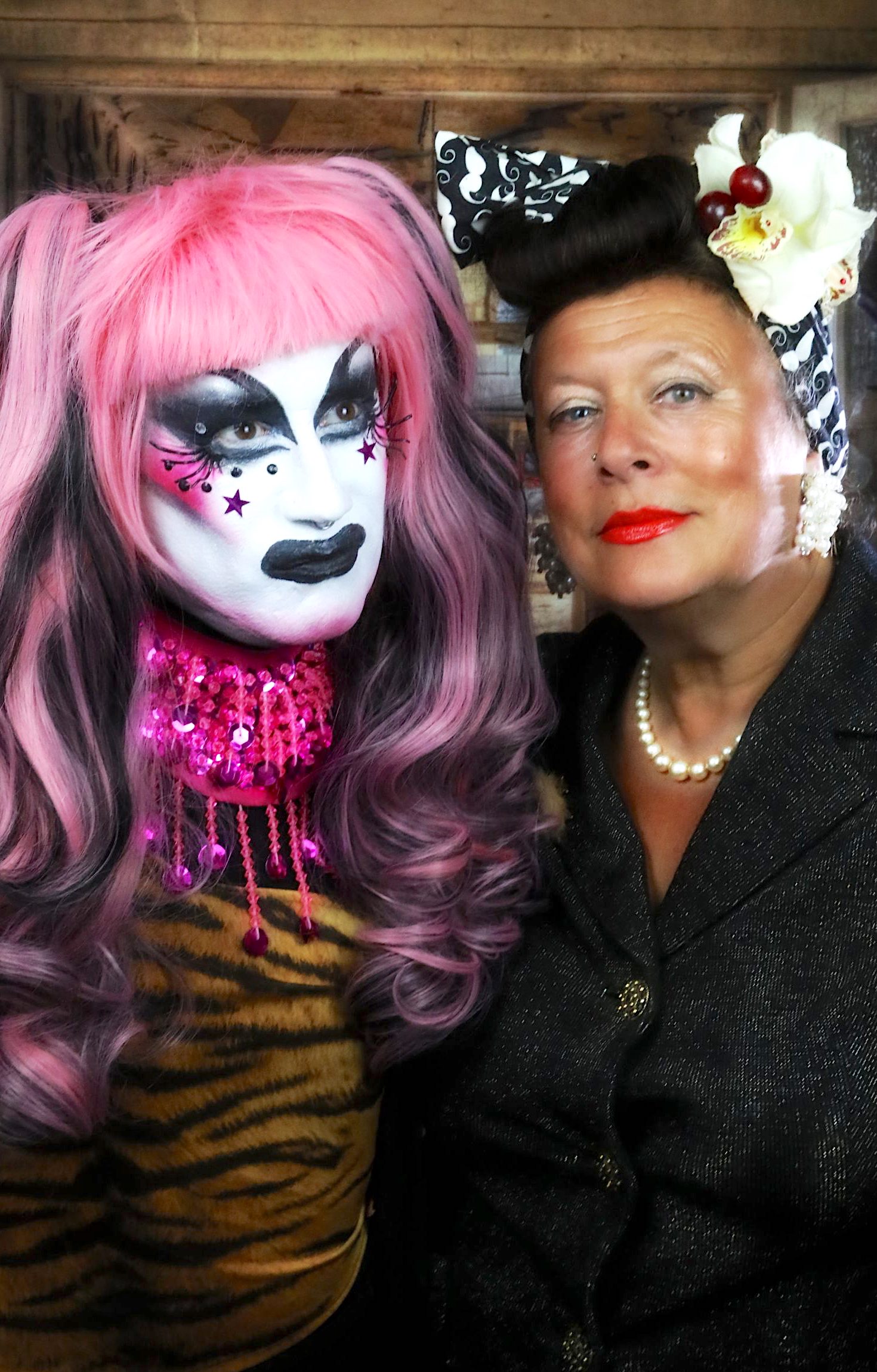 Twiggy in tiger-print top with Karen Jebb, owner of K&B garments, pictured by Gary Lindsay-Moore