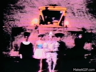 Ashes To Ashes video 1980: Bowie’s pierrot with Blitz Kids and bulldozer (© Jones Music / EMI Records Ltd)
