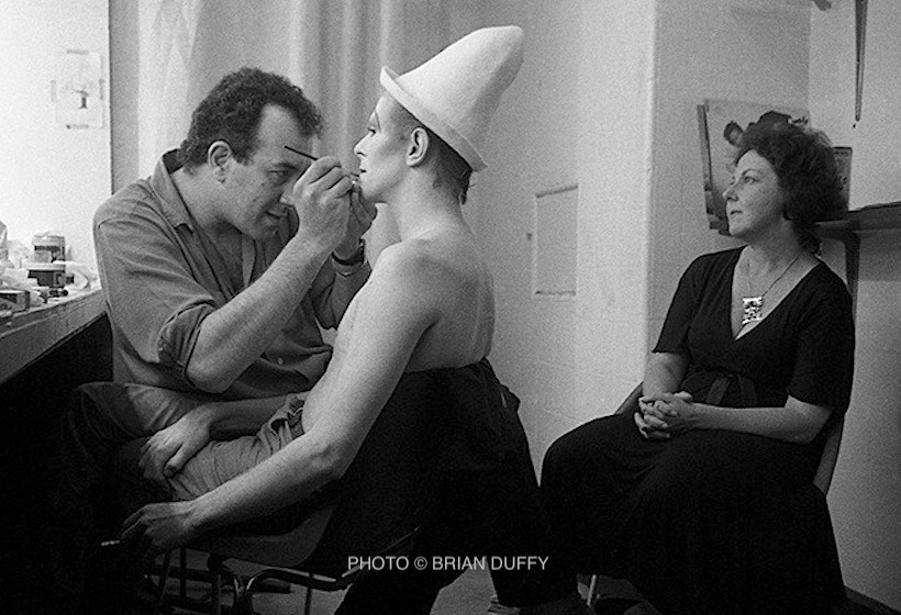 Scary Monsters: Bowie in the chair for makeup artist Richard Sharah, with pierrot’s costume designer Natasha Korniloff. (Photo by Duffy)