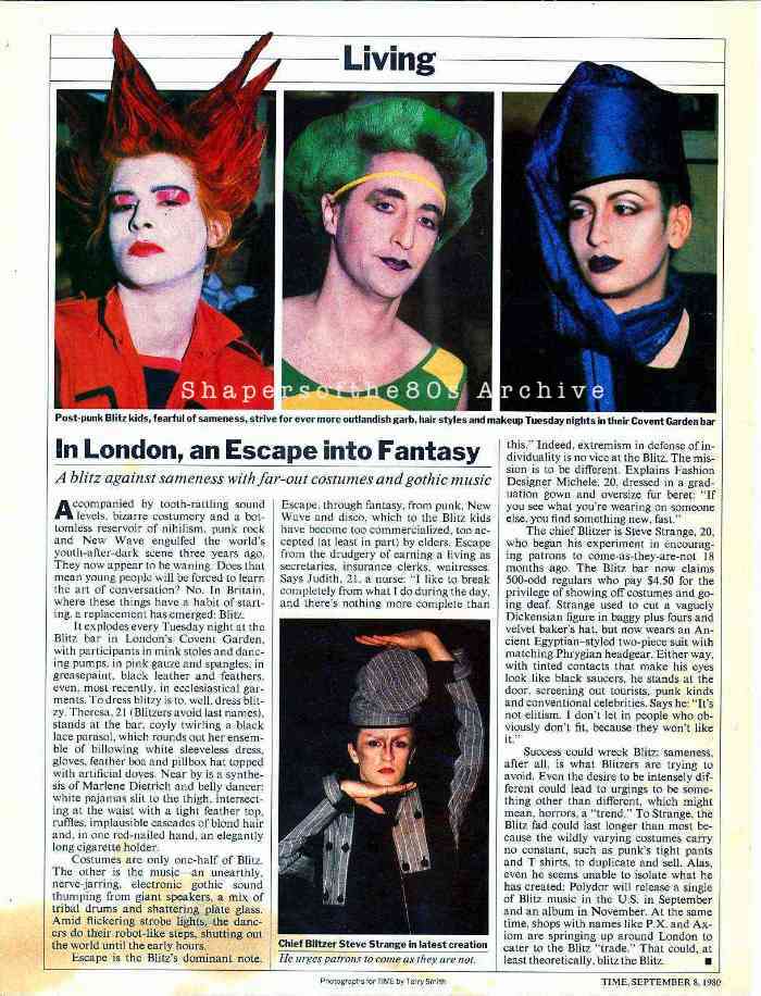 TIME magazine, Sept 8, 1980: Pictured along the top, Blitz Kids Harley Price, Philip Sallon and Lesley Chilkes. Downpage, Steve Strange, all photographed by Terry Smith