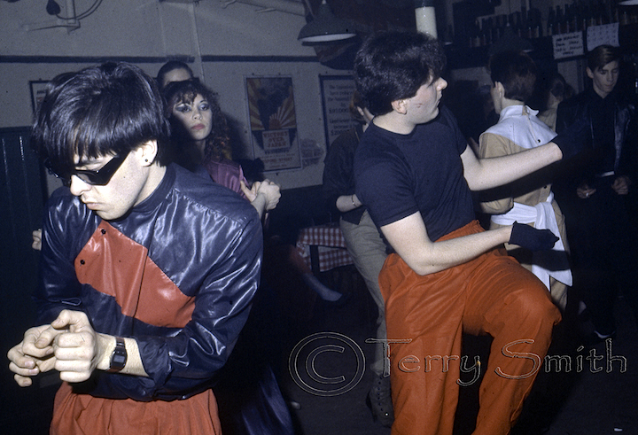 Can you name this pair of dancers, setting their own trend in red plastic pants? The Blitz Kid lurking in the shadows at extreme right is, we’re told, Steve Pullen. Any other names known?