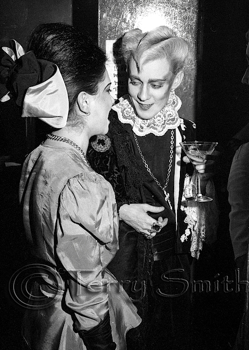 Two style leaders at the Blitz: Julia Fodor, cloakroom attendant and assistant at the PX designer clothes shop, with St Martin’s star designer Stephen Linard who insists this is his Gay Vampire look with garments from Antiquarius (not Charles Fox) and hair by Keith at Smile that day