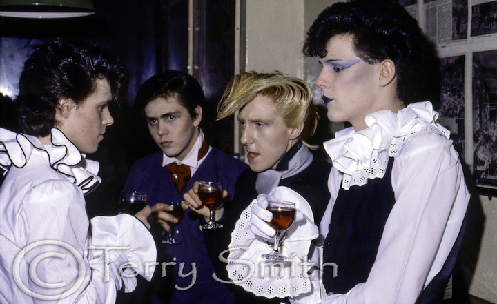 A frilly posse of New Romantics from Harlow at the Blitz 1980: from the left, Andy Bulled, Russell Williams, Jon Lockwood with golden “Seagull” quiff and Tommy Crowley