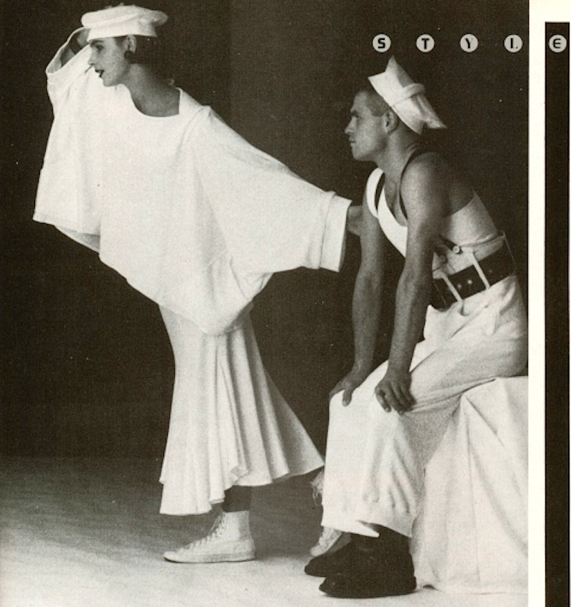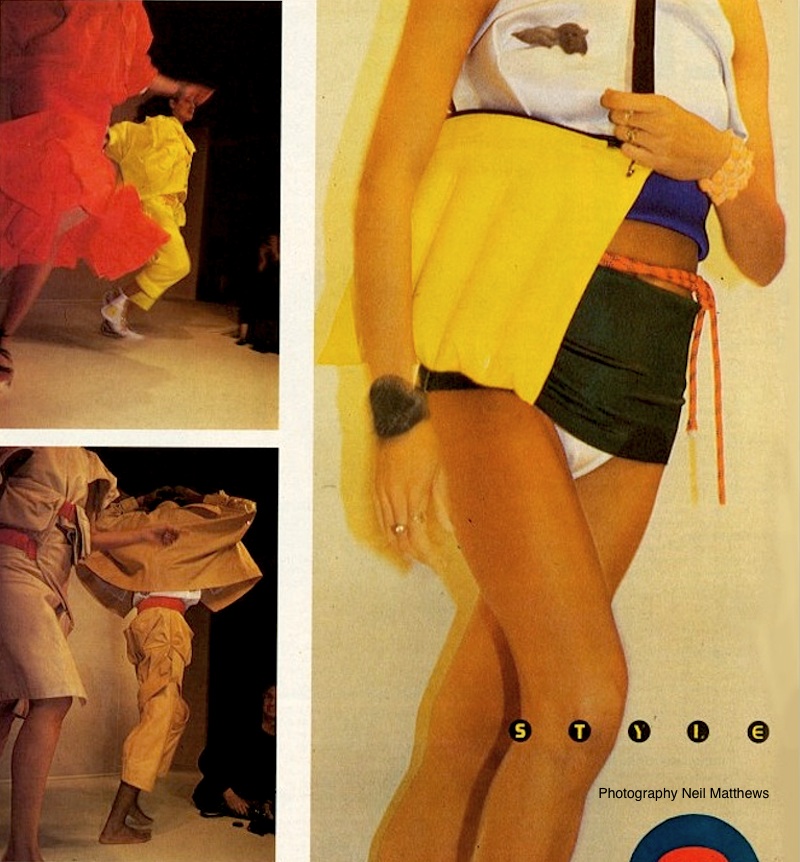 A dozy harem of sluts with smeared mouths cruised the catwalk, some staggering on doorsteps roped to the foot, some flaunting a million watts worth of latest fluorescent dyes, some flashing more bare cheek than Paris is used to. Here were skimpy tube swimsuits in bonded foam; Shalamar’s Jeffrey Daniel leading a Samurai patrol in bondage denim; silk dresses with French lace collars, very prim and very un Worlds End; and endless soccer squads in dazzling team strips of scarlet, green and gold, panelled and gusseted every whichway in black tape to create the nearest Worlds End will ever get to Y fronts.