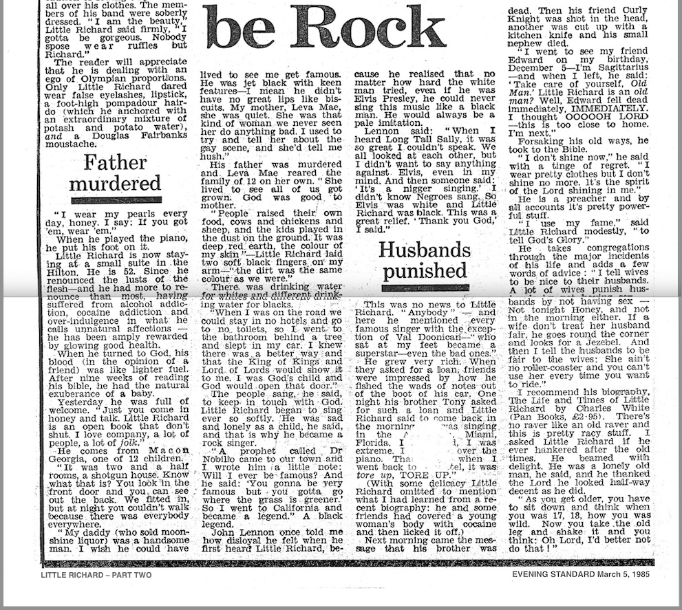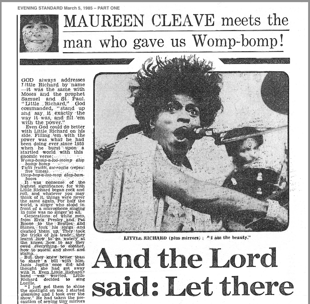 When family life took first place Maureen moved on, later finding a credible niche at the Standard writing face-to-face interviews with all manner of folk, both celebrated and unknown, refreshing for their frankness in a period when being a star interviewer was all about point-scoring powerplay. By then she applied her golden rule to most popstars too, but when Little Richard hit London in 1985 – 30 years after he had declared himself the originator of rock-n-roll – she knew he was one popstar who still had plenty to say. After yesteryears of larger-than-life rebellion and variegated loucheness, he had by then discovered the Gospel, hence the headline on Maureen’s encounter: “And the Lord said: Let there be Rock”.