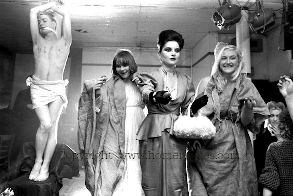 Easter 1980 at Steve Strange’s Blitz club-night: Julia Fodor leads Jennifer Binnie and sister Christine (“Miss Binnie” the artist), both clad in sackcloth, in their first performance piece at the club. Fashionista Iain R Webb sacrifices himself on the cross. Photographed by Homer Sykes
