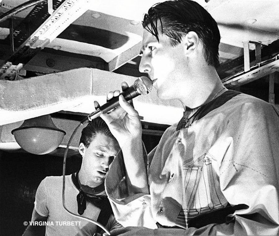 July 1980: For the house band of the Blitz club, Spandau Ballet, image was as important as the music. Here we see Martin Kemp and Tony Hadley during a rare performance aboard HMS Belfast to an invitation audience of New Romantics. Photographed by Virginia Turbett