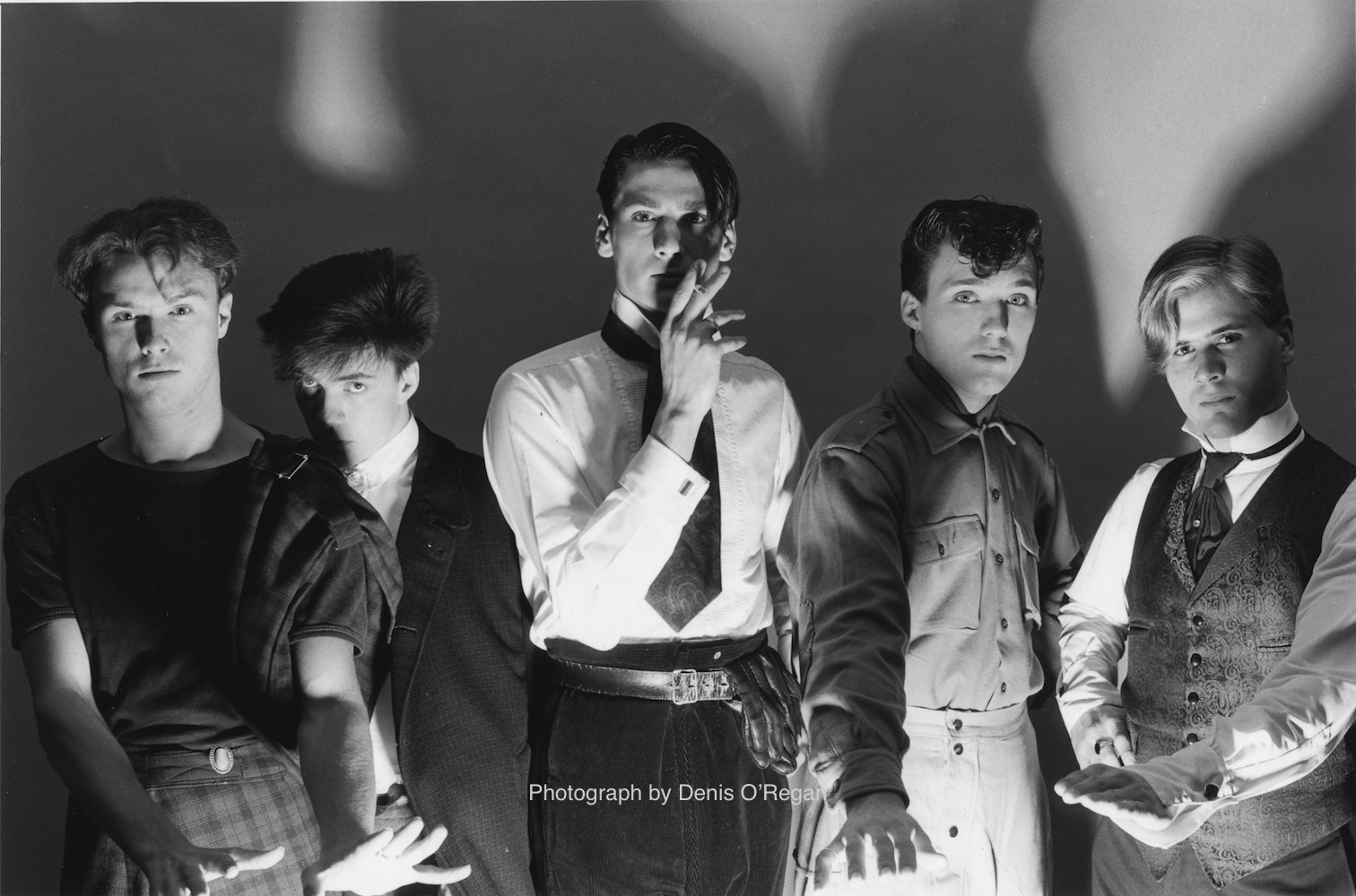 The drama begins: for their fourth public performance the as yet unsigned Spandau Ballet have been made over by designers Willy Brown and Simon Withers, uplit here by photographer Denis O’Regan in stark expressionist style which is what met their first seated audience at the Scala Cinema in March 1980