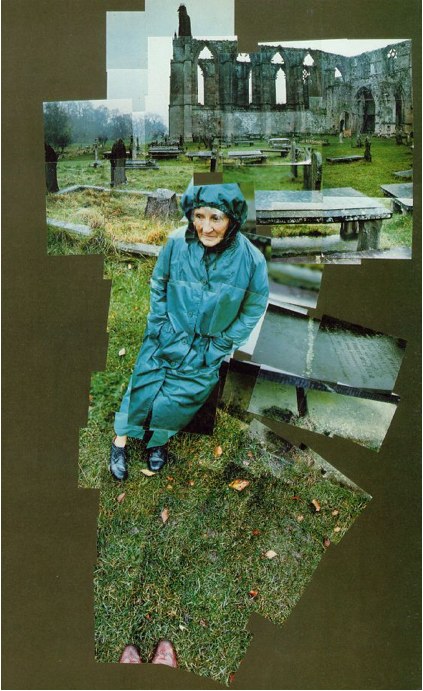 Photo-collage with the artist’s feet visible: My Mother, Bolton Abbey, Yorkshire, Nov 82 #4. (Collection David Hockney)