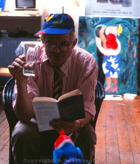 Hockney at his Kensington studio in London, July 3, 1983: so keen to deal with his new ideas, he reads aloud from Shattuck’s book about Proust while the toy parrot on his table listens. Photographed © by Shapersofthe80s