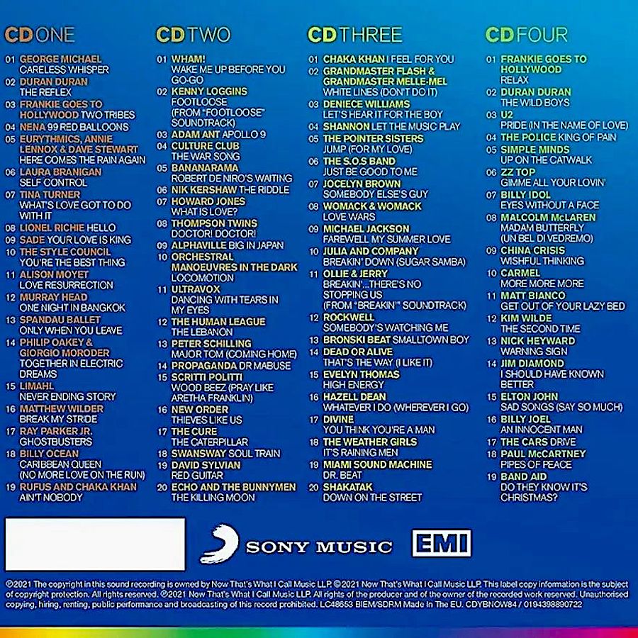 ❏ Update October 2021 – We should be grateful for this four-CD Now Yearbook for 1984 but sadly it proves to be a big missed opportunity. The Now That’s What I Call Music franchise has picked 78 singles from one of the most musically fertile years in the Swinging 80s, yet almost half are dinosaurs from the USA or makeweights such as Murray Head and Peter Schilling (rare exceptions obviously are giants such as Chaka Khan, Tina Turner and Michael Jackson). What Now ’84 could have done was to dedicate all of its 78 tracks to the innovative British bands who changed the course of music history in the UK and across the globe, and it would still have been ignoring the 100+ other British acts listed on this page. Wakey-wakey, Now!