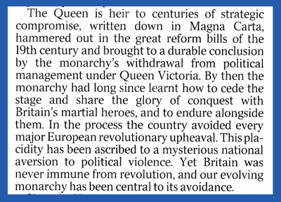 Much is made of how well the British mount large-scale ceremonials, which always rest heavily on our love of dressing up. This tradition starts and ends with the monarch and centuries of practice, which means that in the modern era the relevance of a monarchy is always subject to review. At such times the nation turns to our oldest daily paper, The Times (est’d 1785) and of all the national newspapers this morning The Thunderer rose best to the occasion. Dedicating a whole page to its editorial, the paper invoked Shakespeare’s “this scepter’d isle” speech to offer an appreciation of our 1,200-year history during which rebel barons forced King John to grant us basic liberties through Magna Carta in the year 1215. Sadly, since the paper began charging for online access, most Brits will not have read this stirring and unsentimental analysis. Here’s an extract…