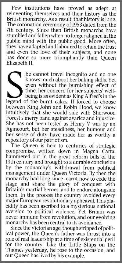 “ Elizabeth II owes her unarguably special hold on British life not simply to heredity but also to the fact that she, like the little ships, is a living connection to modern Britain’s founding wartime myth. That connection cannot endure indefinitely. The past may be another country. But so is the future.