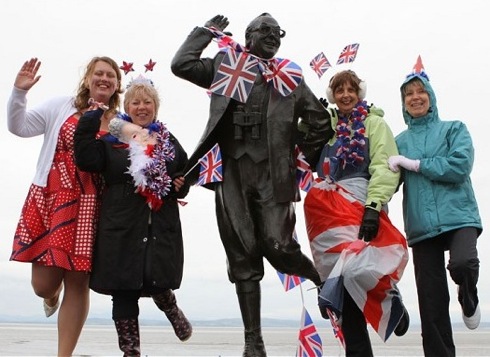 Morecambe, the Lancashire seaside resort: By the Eric Morecambe statue, rain doesn’t stop people celebrating the Diamond Jubilee. (Photo: Rachel Adams)