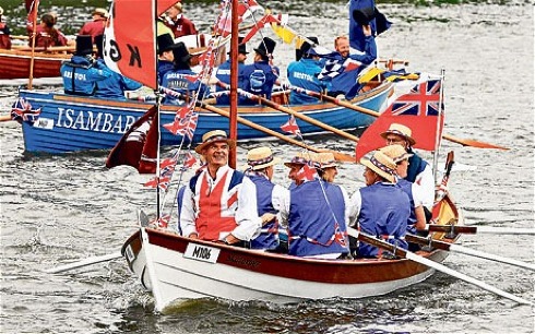 In the Thames flotilla: A Shetland yoal manned by Kingston Grammar School veterans upstages a boat full of Brunels (Photo: Anthony Devlin)