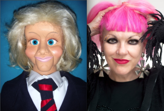 Could a clue to the gifted designer’s identity be found in the range of puppets themselves? Study the photographs below: one is the Kallini puppet marketed as “Traditional Style Schoolgirl Ventriloquist Dummy” (note the studiously knotted school tie). The other shows a well-known British fashion designer, whom we are unable to name. Yet the coincidence of looks and couture choices provides convincing evidence of a link between the pair.