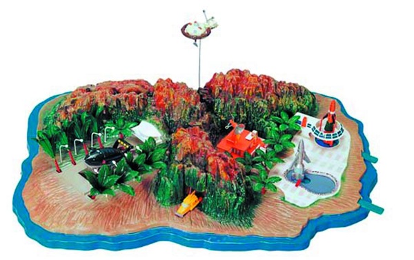Thunderbirds’ secret base at Tracy Island: model kit comes with miniature versions of the Thunderbird 1, 2, 3, 4, and 5. “Some assembly required.” From Dragon Models USA, $115