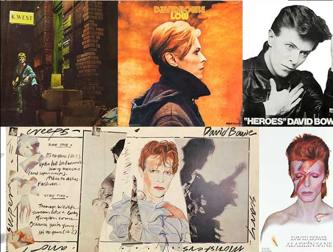 Bowie’s search for identity: the hippy look for the Hunky Dory sleeve 1971 and red-haired alien for Space Oddity 1972. (Photos by Brian Ward and Mick Rock)