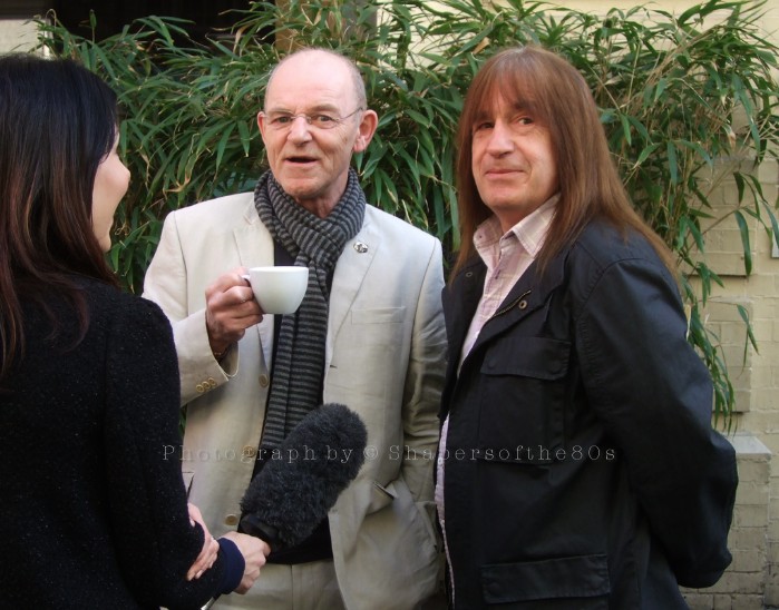 March 27, 2012: Spiders Mick Woody Woodmansey and Trevor Bolder being interviewed at the unveiling of the plaque to Ziggy Stardust in Heddon Street, London. Photo © Shapersofthe80s