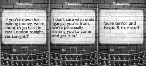 London riots, Saturday: three text messages sent via the BlackBerry BBM service by some organising hand to rally looters. (BBC)