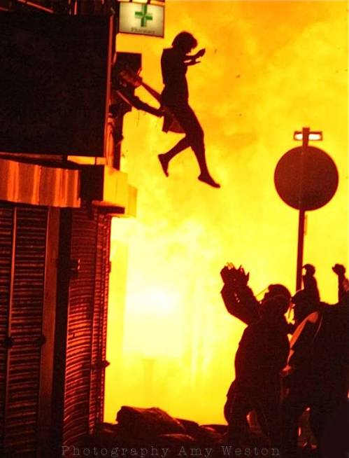 ❏ Update Aug 10: The photographer Amy Weston took this dramatic shot on Monday night in what she called a “war-zone”, meaning the outer London borough of Croydon where the House of Reeves furniture store was ablaze [below]. It was published on the front page of Tuesday’s final editions of the Guardian, Times, Sun, Daily Mirror and Daily Telegraph and in many other papers. Weston says: “In front of me was this fire with six or seven riot police and this lady falling from a window, but directly behind me was Surrey Street market where the larger stores sell electrical products… As I turned around it was like a war-zone… People were turning on each other and beating each other up, and mugging and robbing each other. That’s when I took my cardigan off and wrapped it round my camera so nobody could see what I had and I ran as fast as I could through that crowd back to my car.” Listen to the full four-minute interview for BBC Radio 4’s Media Show here: