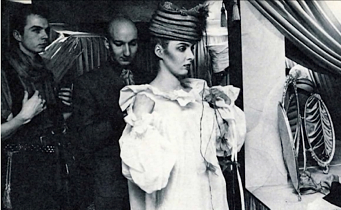 1979, Kim Bowen models for milliner Stephen Jones, assisted by Lee Sheldrick in the Jones boutique