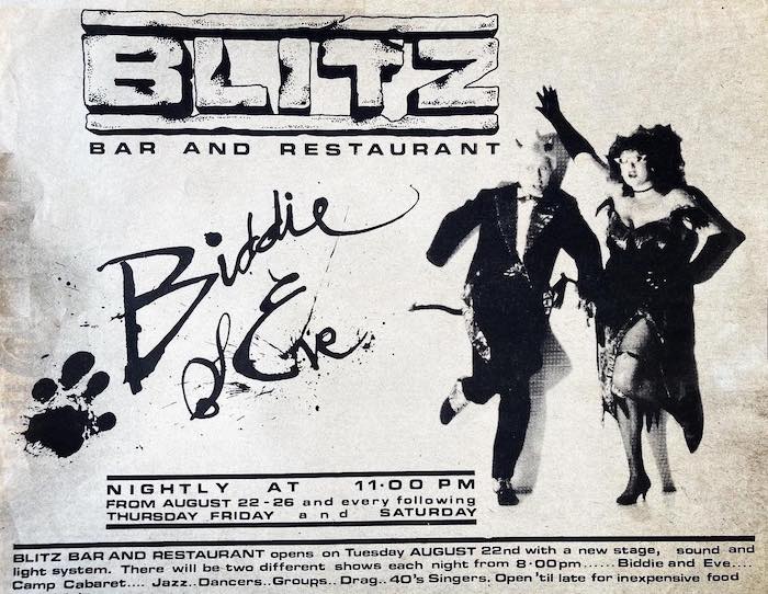 Despite having the Irish charmer Brendan Connolly as manager, and the dashing Peruvian Mario Testino behind the bar (as well as Sally, Ian Harington, Mike Roskams, Mick Hurd, Roy Brentnall, Paul Frecker and many, many others), the Blitz with its gorblimey menu wasn’t frankly much of a success. As the oil crisis squeezed western economies in the austere 70s, so London nightspots started resorting to cabaret to attract custom. Coinciding with a menu upgrade, the first performers to make their name at the Blitz were the song-and-dance duo Biddie & Eve.