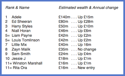 Writing about broader shifts in wealth within society, Robert Watts, who compiles the Sunday Times Rich List, said: “Streaming services, the internet and income from endorsements are helping today’s young musicians build an international following – and with it their fortunes – far quicker than the older rockers. Some of the biggest risers [proportionately] over the past year have been amongst younger acts such as Ed Sheeran, Adele and Calvin Harris.”