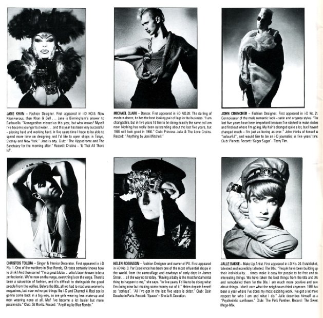 More of Nick Knight’s “People of the 80s”: Brummie fashion designer Jane Khan, dancer Michael Clark, fashion designer John Crancher, singer and interior decorator Christos Tolera, fashion designer and owner of PX Helen Robinson, make-up artist Jalle Bakke