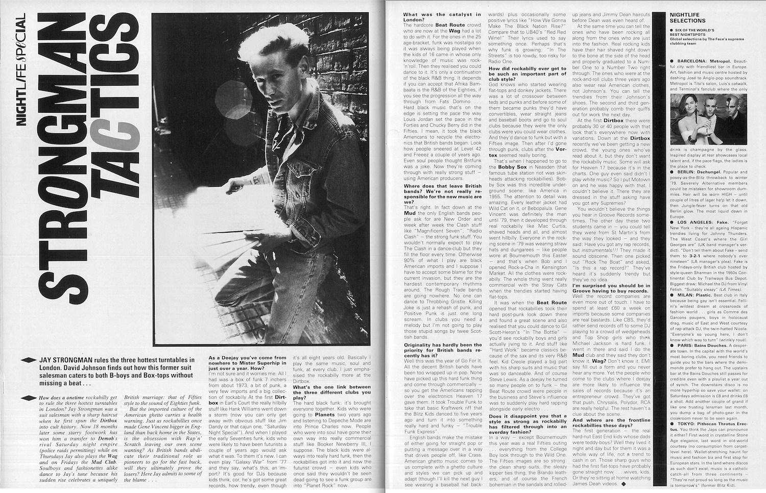 TAGS – The Face, journalism, interview, Jay Strongman, nightlife, reviews, funk, Prince Charles, Afrika Bambaata, dance music, Dirt Box, Demob, Wag club, Mud club, Plastic Club Milan, Rock-a-Cha, Stray cats, Trouble Funk, Bobby Sox, In The Streets, In The Bottle, Kid Creole, Los Angeles