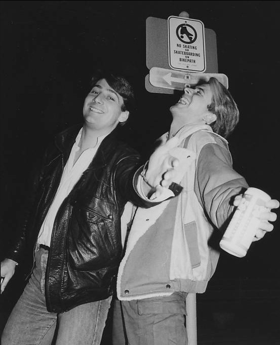 Bad boys abroad: Spandau’s Hadley and Norman consider local skating restrictions in LA in 1983. Pictured by © Shapersofthe80s
