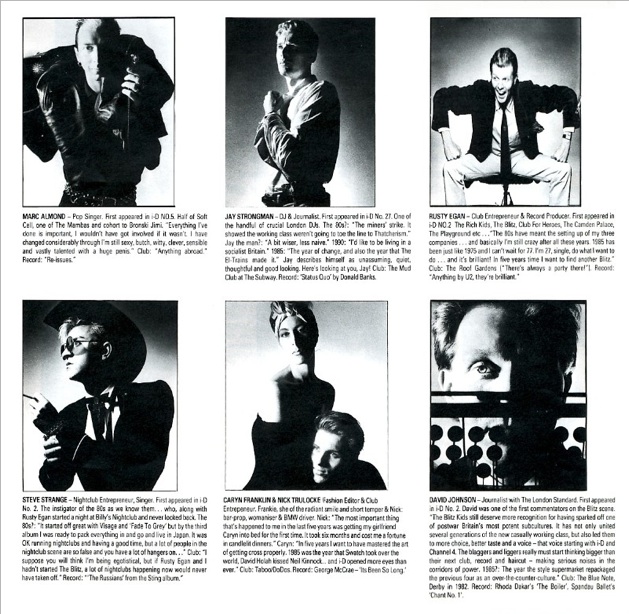 “People of the 80s”: for i-D magazine’s fifth anniversary, 100 were photographed in 1985 © by Nick Knight. Top left, pop singer Marc Almond, deejay and journalist Jay Strongman, club entrepreneur Rusty Egan, singer and club entrepreneur Steve Strange, fashion editor Caryn Franklin and club entrepreneur Nick Trulocke. Finally, we see that hack from the London Evening Standard, Yrs Truly.
